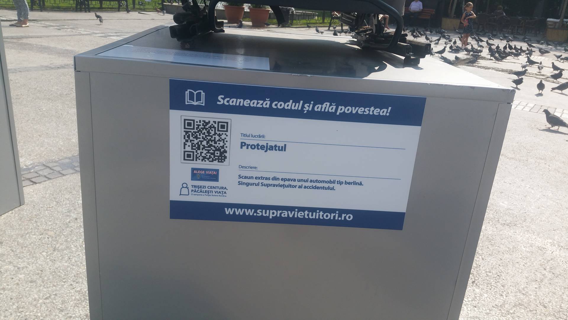 Acțiune inedită a polițiștilor de la Rutieră! 14 scaune din autoturismele care au fost implicate în accidente mortale au fost expuse în Piața Unirii.
