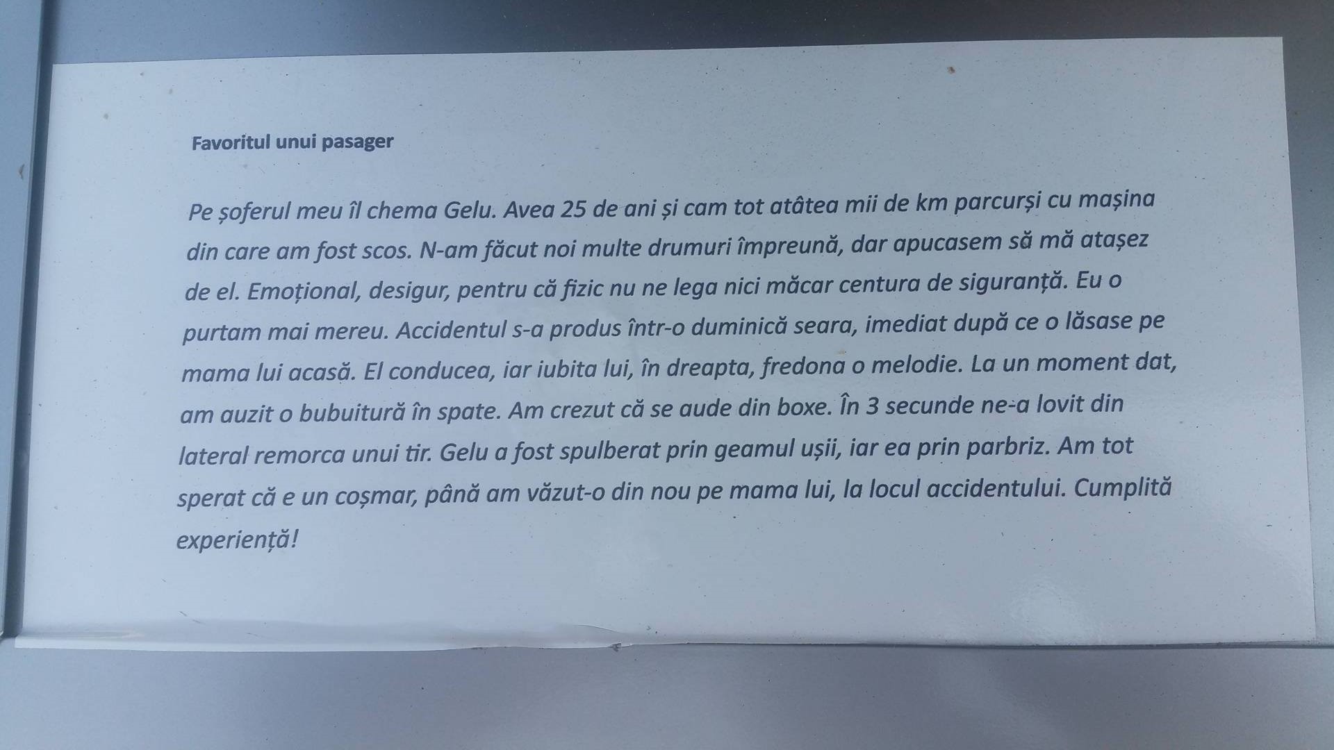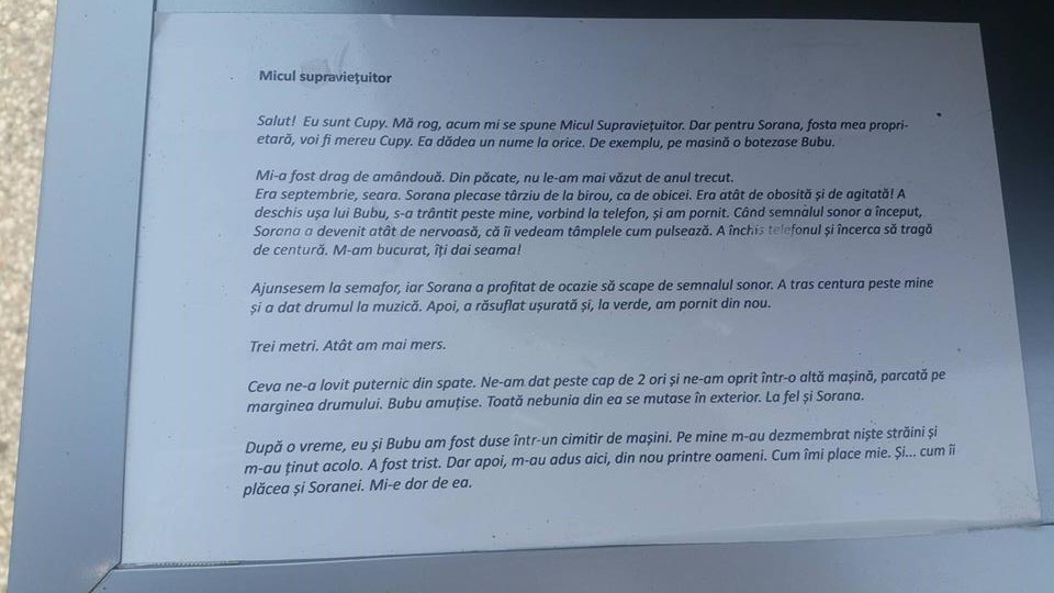 Pe fiecare scaun este lipit un bilet cu evenimentul tragic prin care a trecut. Scaunele se află în fața Hotelului Unirea, iar ieșenii sunt așteptați să vină să le vadă și să le afle poveștile.