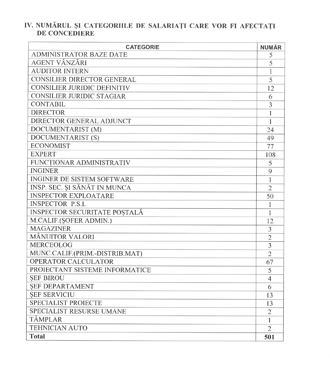 Cert este că Poșta vrea să concedieze 501 de salariați, iar cei mai mulți sunt încadrați ca experți (108 de persoane). Alte categorii de salariați în cazul cărora vor fi făcute disponibilizări numeroase sunt: economiști (77 de persoane), documentariști (73), operatori de calculator (67), inspectori exploatare (50) și consilieri juridici (18). Pe lista concedierilor se vor afla și persoane cu funcții de conducere: directori, directori adjuncți și șefi de diverse departamente. Nu în ultimul rând, alte persoane vizate lucrează ca agent vânzări, șoferi, administratori de baze de date, ingineri, auditori și alți funcționari.