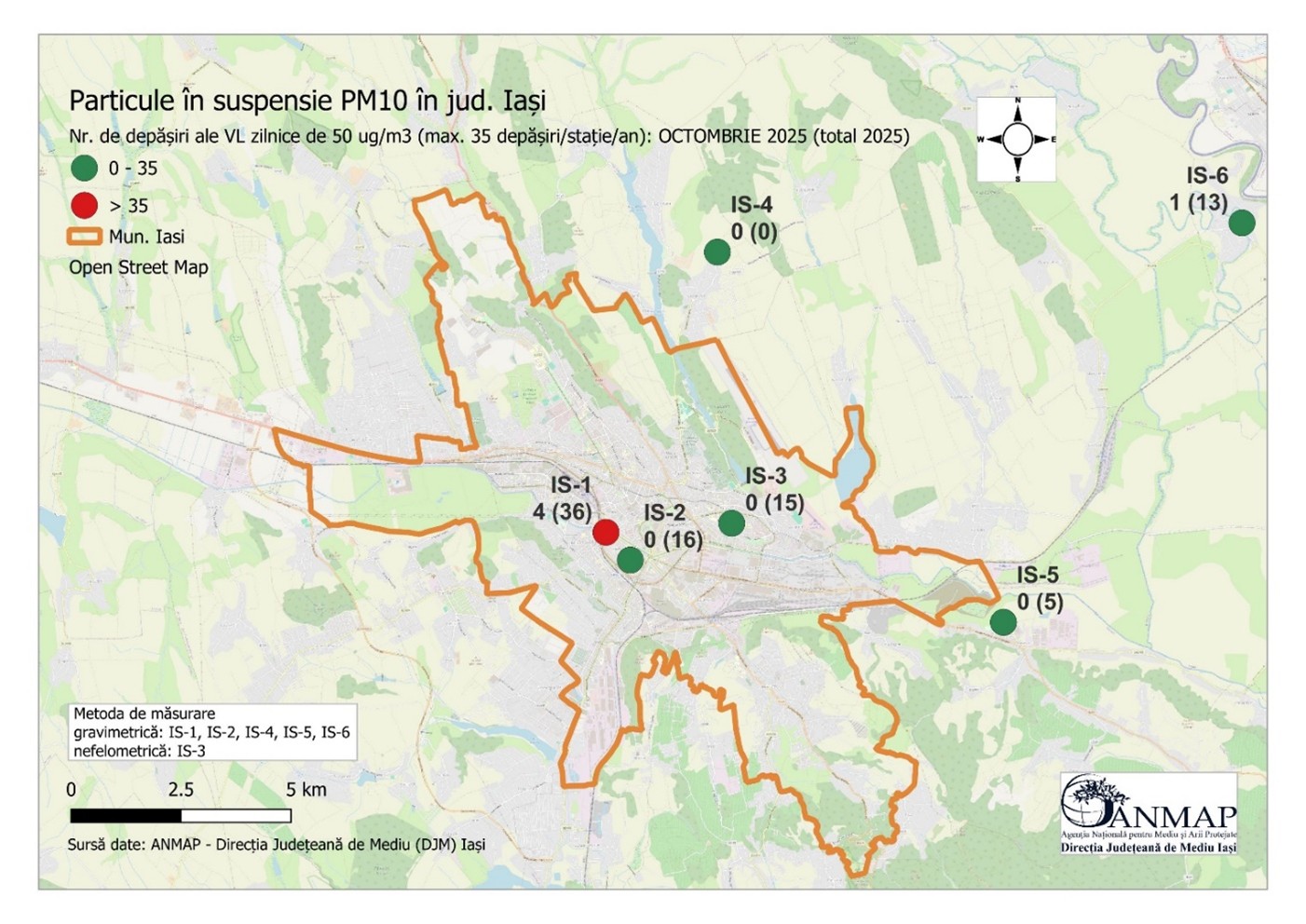 În octombrie 2025, aerul din Iași a arătat din nou că poluarea este o problemă serioasă pentru sănătatea oamenilor. Direcția Județeană de Mediu Iași a înregistrat mai multe depășiri ale nivelului admis de particule în suspensie PM10, substanțe care pot provoca afecțiuni respiratorii și alte probleme de sănătate. Cea mai gravă situație s-a înregistrat în zona Podu de Piatră, o stație situată într-o zonă cu trafic intens, unde valoarea limită zilnică a fost depășită în patru zile distincte ale lunii (în 15, 16, 22 și 31 octombrie, cu un vârf în ultima zi a lunii), dar și la stația din Bosia-Ungheni, unde s-a înregistrat o depășire a limitelor admise de particule în suspensie PM10.