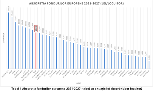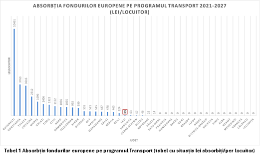 Pentru o imagine completă, Tabel 4 ne oferă informațiile complete în ceea ce privește absorbția în lei/locuitor. Observăm că Iașul, cu cei 89 lei per locuitor atrași până în prezent, se poziționează în zona mediană a clasamentului, confirmând o dinamică moderată în raport cu potențialul său demografic și economic.