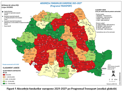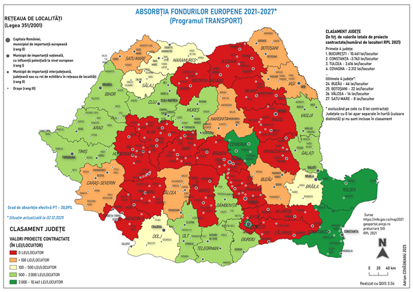 De subliniat că, la nivelul lunii noiembrie 2025, gradul efectiv de absorbție al Programului Transport este unul modest, ceea ce sugerează că majoritatea proiectelor se află încă în faze intermediare de implementare, cu potențial semnificativ de creștere în anii următori.