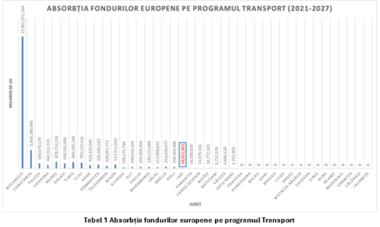 În ceea ce privește performanța județelor din regiunea istorică moldavă, Galațiul se clasează pe locul 7, cu aproape 700 milioane lei absorbite. Județul Vaslui ocupă poziția 16, Iașul coboară până pe locul 21, iar Botoșani ajunge pe locul 25 (Tabel 3). Această distribuție reflectă o dinamică regională neuniformă și o diferență clară între județele conectate la proiecte majore și cele aflate în zone cu infrastructură insuficient valorificată.