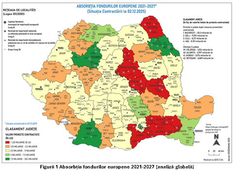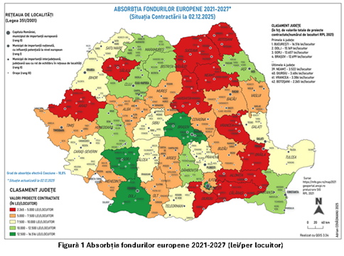 Situația prezentată în Tabel 1 în care toate județele sunt evidențiate, relevă că distribuția fondurilor nu reprezintă doar o simplă alocare financiară, ci funcționează ca o veritabilă „hartă” a capacității de dezvoltare și a potențialului regional. Această distribuție spațială exprimă în mod direct nivelul de pregătire instituțională, maturitatea administrativă și dinamica economică a fiecărei regiuni.
