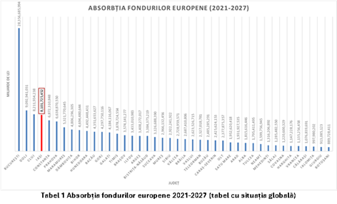 În același timp, în ceea ce privește fondurile globale aferente coeziunii, se conturează diferențe clare între județele capabile să absoarbă eficient resursele disponibile și cele în care capacitatea administrativă limitată generează un comportament instituțional fragil, caracteristic unei organizări precare.