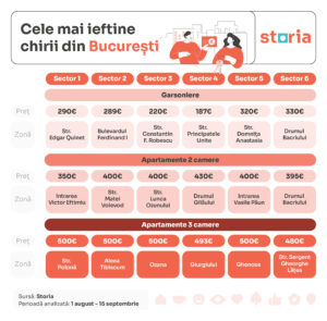 În București, cele mai ieftine chirii pentru această categorie sunt de 330 de euro pe Intrarea Victor Eftimiu (Sectorul 1), urmată de 395 de euro în zona Drumul Bacriului din sectorul 6. 400 de euro costă cea mai ieftină chirie din sectoarele 2, 3 și 5, respectiv pe Strada Matei Voievod, Strada Lunca Ozunului și Intrarea Vasile Păun.