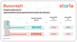 În București, în luna iulie, prețul mediu solicitat a fost de 1.849 euro/mp pentru apartamentele noi (+2% față de iulie 2024), respectiv 2.309 euro/mp pentru cele vechi (+21%). Raportat la suprafața medie a locuințelor, prețurile apartamentelor noi au fost următoarele: aproximativ 73.950 euro pentru o garsonieră de 40 mp, 101.680 euro pentru un apartament cu două camere (55 mp) și 138.654 euro pentru unul cu trei camere (75 mp).