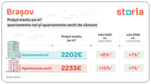 Tendința ca apartamentele vechi să aibă prețuri medii mai ridicate decât cele noi s-a menținut și în Brașov. În luna iulie, prețul mediu solicitat a fost de 2.202 euro/mp pentru locuințele noi, respectiv 2.233 euro pentru cele vechi. Pe metru pătrat a fost de 2.202 euro pentru apartamentele noi și de 2.233 euro/mp pentru apartamentele vechi.