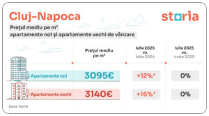 În Cluj-Napoca, diferențele dintre prețurile medii de cerere pentru apartamentele noi și cele vechi sunt destul de mici, indiferent de tipul locuinței. În luna iulie, prețul mediu pe metru pătrat a fost de 3.095 euro în cazul apartamentelor noi și de 3.140 euro pentru cele vechi.