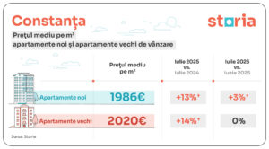 În Constanța, apartamentele vechi au avut, în continuare, prețuri medii de cerere mai ridicate decât cele noi, iar diferențele au fost mai vizibile în cazul locuințelor mai mari. În luna iulie, prețul mediu pe metru pătrat a fost de 1.986 euro pentru apartamentele noi și de 2.020 euro pentru cele vechi.