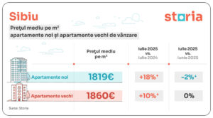 Și în Sibiu apartamentele noi au avut, în luna iulie, un ușor avantaj de preț față de cele vechi. Prețul mediu pe metru pătrat a fost de 1.819 euro în cazul locuințelor noi, respectiv 1.860 euro/mp pentru cele vechi.
