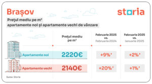 BRAȘOV: În Brașov, prețul mediu cumulat al apartamentelor vechi și noi a fost de 2.161 euro/mp în februarie 2025, în creștere cu 14% față de februarie 2024. Apartamentele noi au ajuns la un preț de 2.220 euro/mp, iar cele vechi au fost evaluate la 2.140 euro/mp.