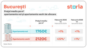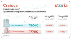 În luna februarie, prețurile medii ale apartamentelor de vânzare – vechi și noi – au înregistrat o creștere de 12% comparativ cu aceeași lună a anului 2024, conform celor mai recente date de pe Storia, platforma de imobiliare lansată de OLX.