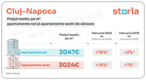 CLUJ-NAPOCA: În februarie 2025, prețul mediu cumulat pentru apartamentele vechi și noi din Cluj-Napoca a fost de 3.036 euro/mp, în creștere cu 16% față de februarie 2024.