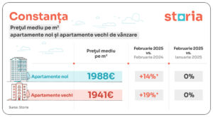 CONSTANȚA: În Constanța, prețul mediu al apartamentelor noi și vechi, cumulat, a fost de 1.961 euro/mp, în creștere cu 17% față de februarie 2024. Apartamentele noi s-au situat la 1.988 euro/mp, iar cele vechi la 1,941 euro/mp.