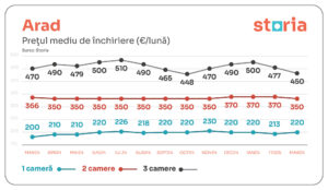 Astfel, în Arad, chiriașii au plătit un preț mediu de 220 de euro pentru închirierea unei garsoniere, 350 de euro pentru un apartament cu două camere și 450 de euro pentru unul cu trei camere.
