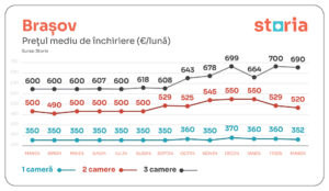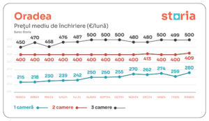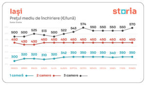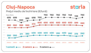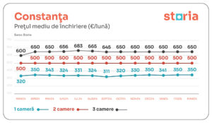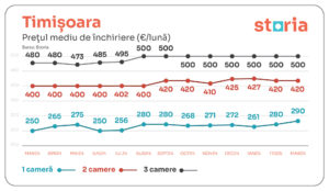 Astfel, chiria medie pentru o garsonieră a fost de 350 de euro, pentru un apartament cu două camere prețul mediu de cerere a fost de 450 de euro, iar pentru un apartament cu trei camere de 570 de euro.