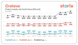 CRAIOVA: În luna martie 2025, în Craiova, prețurile medii de închiriere au fost de 292 de euro pentru garsoniere, 428 de euro pentru apartamentele cu două camere și 591 de euro pentru apartamentele cu trei camere, înregistrând creșteri de 4% în cazul garsonierelor, 7% pentru apartamentele cu două camere și 16% pentru apartamentele cu trei camere, comparativ cu martie 2024.