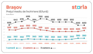 BRAȘOVUL a avut câteva variații, cu o medie de 380 de euro pentru garsoniere (+9% față de anul anterior), 520 de euro pentru două camere ( +4% față de luna august) și 600 de euro pentru trei camere.