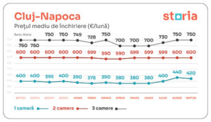 În CLUJ-NAPOCA, chiria medie a unei garsoniere este de 420 de euro (cu 5% mai mare față de anul trecut și cu 5% mai mică față de luna august). În cazul apartamentelor cu două și trei camere, prețurile chiriilor s-au menținut stabile, respectiv de 600 de euro și 750 de euro.