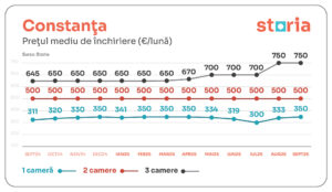 În CONSTANȚA, garsonierele costă în medie 350 de euro, cu 13% mai mult decât în urmă cu un an, iar apartamentele cu trei camere au înregistrat o creștere spectaculoasă de 16%, până la 750 de euro.