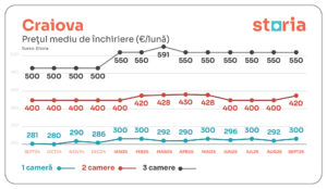În CRAIOVA, garsonierele s-au scumpit cu 7% față de anul trecut, ajungând la 300 de euro, iar apartamentele cu trei camere au ajuns la 550 de euro, cu 10% peste nivelul din 2024.