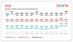În IAȘI, o garsonieră se închiriază în medie cu 370 de euro, cu 6% mai mult decât în septembrie 2024, în timp ce apartamentele cu trei camere au ajuns la 580 de euro, în creștere cu 7% față de anul anterior.