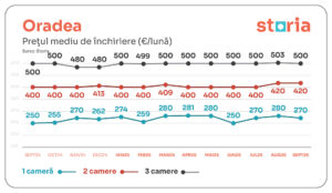 Prețul mediu al unei garsoniere a ajuns în septembrie la 403 euro, în creștere cu 9% față de 2024, în timp ce la apartamentele cu două camere media este de 602 euro, cu 4% mai mult decât în aceeași lună a anului trecut. Pentru apartamentele cu trei camere, chiria medie a urcat la 831 de euro, cu 5% peste nivelul din septembrie 2024.