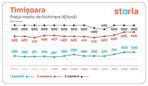 În TIMIȘOARA, chiria medie a garsonierelor este de 300 de euro, cu 7% mai mult decât în urmă cu un an, în timp ce apartamentele cu două camere au ajuns la 450 de euro, tot cu 7% peste nivelul din 2024.