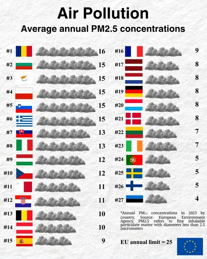 Un clasament recent publicat de Eurostat arată că în 2023 România era cea mai poluată țară din uniunea Europeană cu particule fine PM2.5, cele mai periculoase pentru sănătate. Media anuală este de 16 micrograme pe metru cub – cea mai ridicată din întreaga Uniune, potrivit datelor Agenției Europene de Mediu.