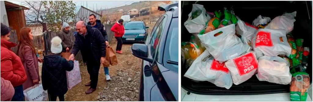 De altfel, odată cu imaginile cu pachetele pregătite în clădirea Căminului Cultural, au fost reluate în spațiul public imagini cu cei de la PSD împărțind de asemenea sacoșe cu alimente.