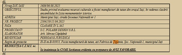 „Au venit niște arhitecți de la București, se urmărește clarificarea statutului acelor clădiri, pentru că pe terenul fostei Fabrici de Țigarete sunt mai multe clădiri, unele construite înainte de război, altele după”, a explicat pentru „Ziarul de Iași” directorul executiv al Direcției Județene de Cultură, Bobi Apăvăloaei, care este și secretar al Comisiei Zonale a Monumentelor Istorice nr. 5 (Iași). Rezoluția comisiei din luna august, publicată și pe pagina https://monumenteiasi.ro/ a fost în favoarea înaintării avizului favorabil către Comisia Națională a Monumentelor istorice pentru un „studiu privind evaluarea resursei culturale a fostei manufacturi de tutun din orașul Iași, în vederea clasării ansamblului în Lista monumentelor istorice”.