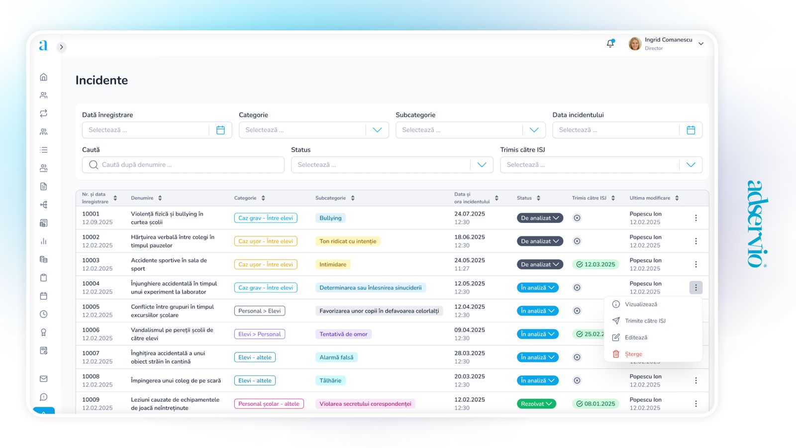 Compania ieșeană Adservio, cunoscută pentru dezvoltarea catalogului digital utilizat în peste 1.200 de școli din România și străinătate, a semnat un parteneriat național cu Inspectoratul General al Poliției Române pentru implementarea mecanismului „Butonul Roșu”, destinat semnalării cazurilor de violență și bullying din mediul școlar.