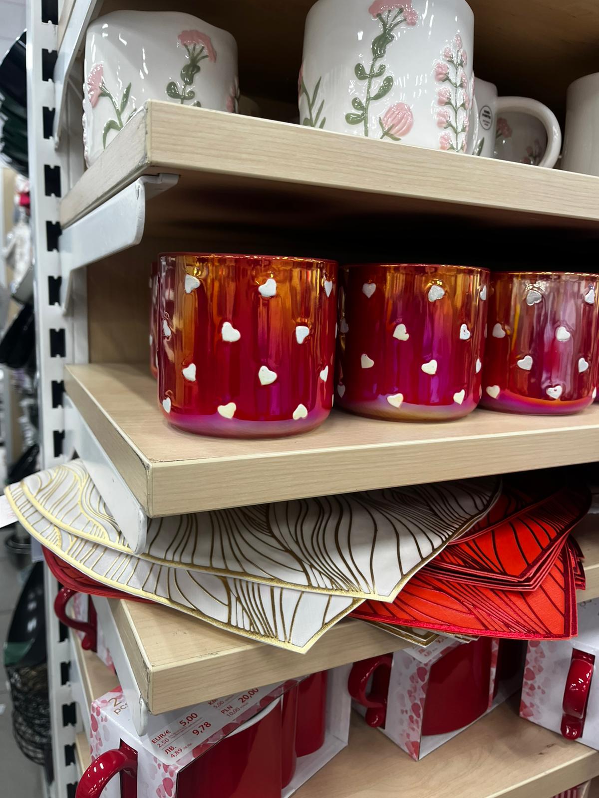 - Căni cu motive romantice (inimi, mesaje tematice), la prețuri de aproximativ 17 lei;