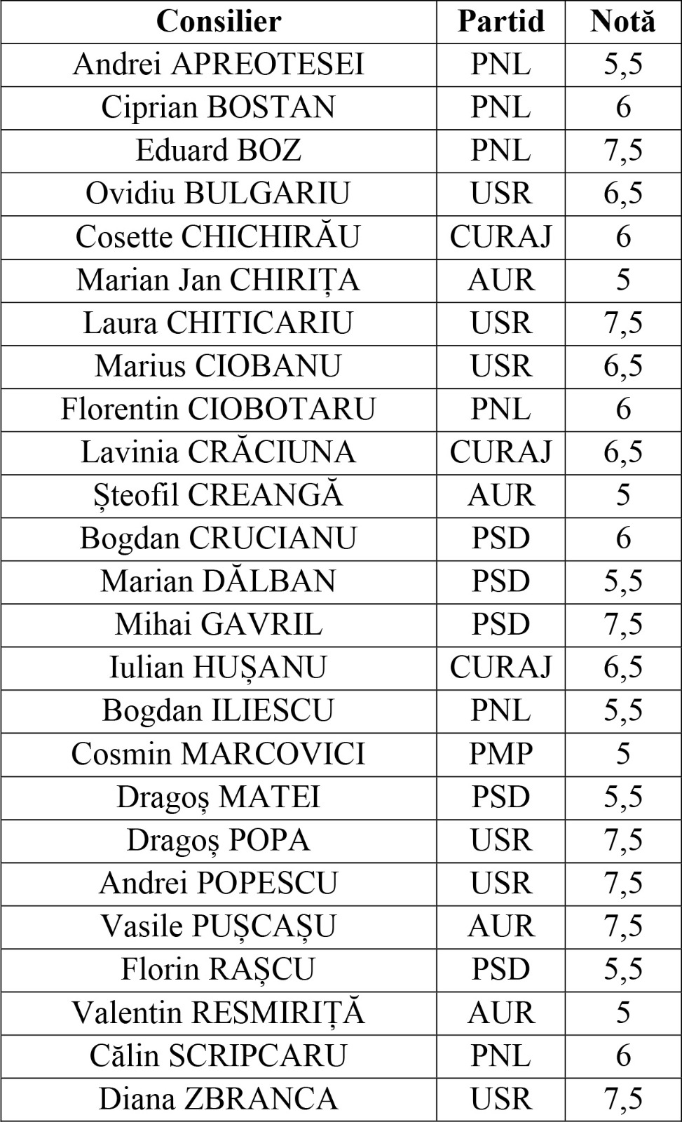 Catalogul cu note cuprinde 25 dintre cei 27 de consilieri locali. Doi dintre aleși fac parte din executiv, respectiv viceprimarii Daniel Juravle (PNL) și Roxana Necula (PSD). Aceștia, alături de primarul Mihai Chirica, vor face obiectul unui sistem de punctare distinct, pe o perioadă mai mare de timp și în baza altor criterii.