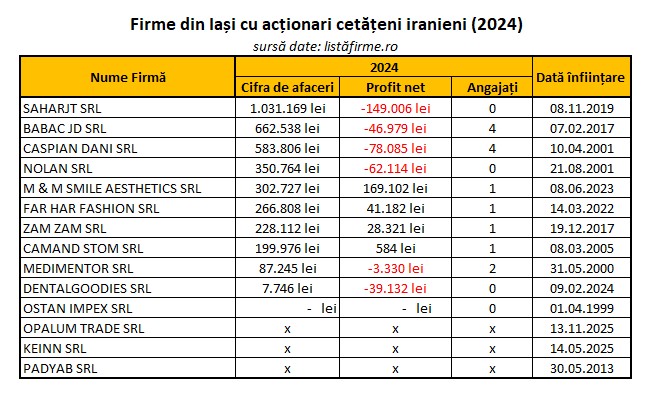 Alte firme cu profil comercial mai restrâns sunt Far Har Fashion SRL, înființată în 2022 și deținută de Farmazi Alireza, care activează în comerțul cu îmbrăcăminte și a încheiat anul cu un profit de peste 41.000 de lei, și Zam Zam SRL, fondată în 2017 de Mehran Ghorbani și Florina Nina Ghorbani, care are un profit de circa 28.000 de lei.