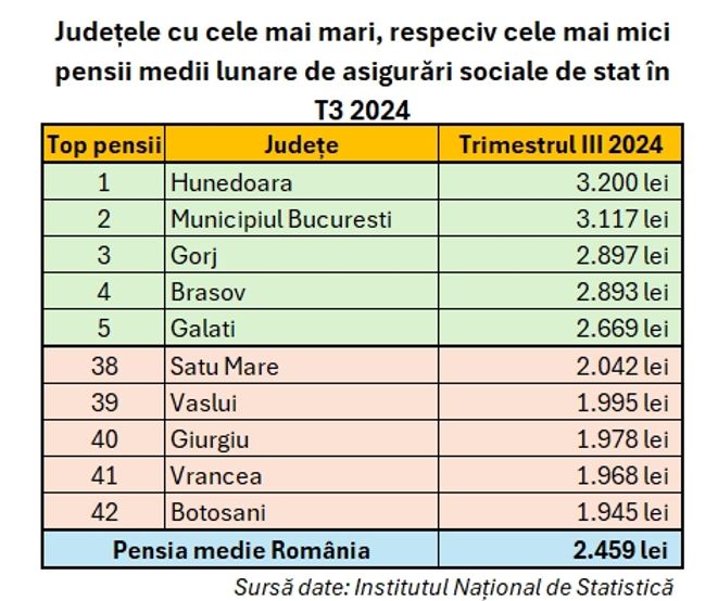 Pensii de asigurări sociale de stat mai mari decât media pe țară au primit, în medie, pensionarii din Municipiul București și din 11 județe. Însă cele mai mari pensii din țară sunt încasate de hunedoreni. La Hunedoara, pensia medie lunară în trimestrul al treilea din acest an a fost de 3.200 de lei, cu peste 64% mai mult decât pensia medie din Botoșani și cu 83 de lei mai mult decât au încasat, în medie, pensionarii bucureșteni.