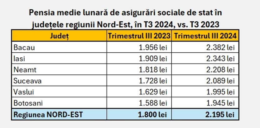 Cei mai săraci pensionari ai României au fost, și în trimestrul al treilea din acest an, vârstnicii din județele Regiunii Nord-Est. Iar cei mai săraci dintre săraci, după nivelul pensiei medii de asigurări sociale de stat, au fost botoșănenii. Pensia lunară medie în țară a fost în perioada iulie-septembrie de 2.459 de lei, în creștere cu 452 de lei față de același interval din 2023.