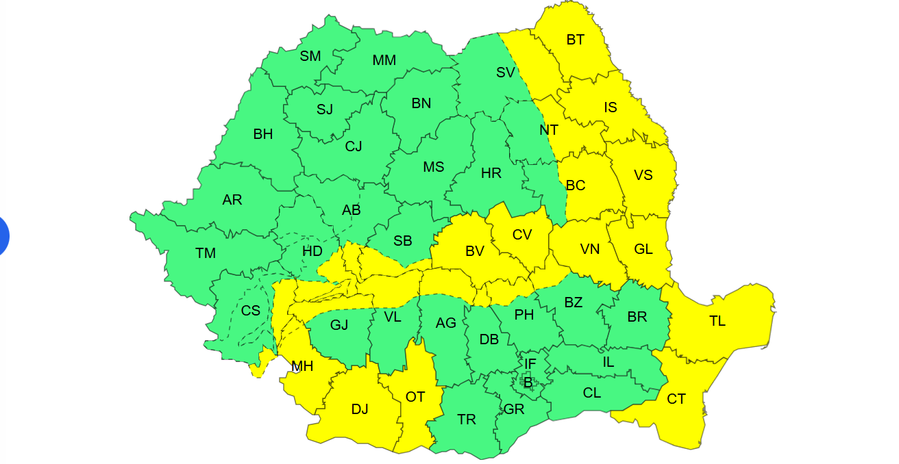 De luni dimineaţă, de la ora 10 şi până la ora 23, este în vigoare o atenţionare cod galben pentru Moldova, Dobrogea, sudul şi vestul Olteniei şi sud-estul Transilvaniei, unde vor fi intensificări ale vântului cu viteze de 50…70 km/h.