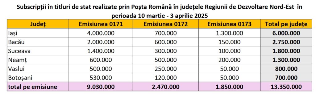 Subscripții în titluri de stat realizate prin Poșta Română în județele Regiunii de Dezvoltare Nord-Est în perioada 10 martie – 3 aprilie 2025