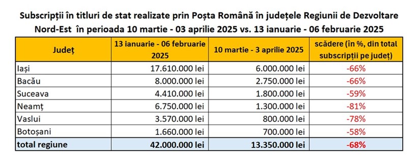 Campionii subscrierilor prin Poșta Română din Regiunea Nord-Est au fost, și în luna martie, ieșenii. De altfel, Iașul a fost județul în care au scăzut cel mai puțin investițiile în titlurile de stat cu maturitate de 5 ani (-32%, față de Bacău, cu -75%, de exemplu).