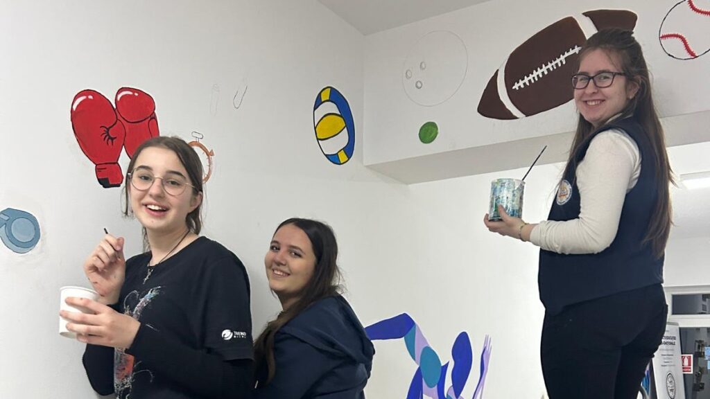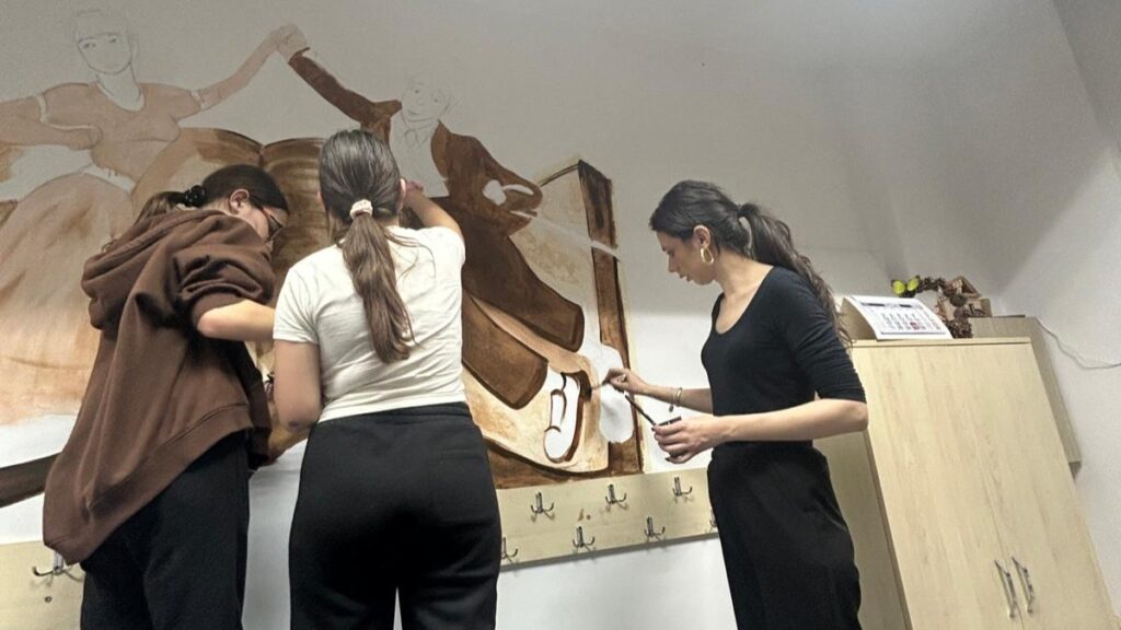 Un exemplu este proiectul realizat în colaborare cu disciplina Istorie: rame realizate direct pe perete, din pastă de relief, în interiorul cărora elevii au pictat ruine.