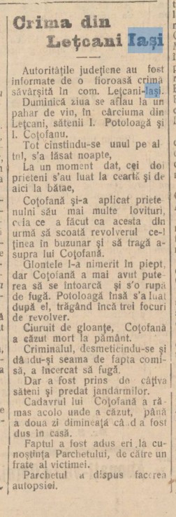 Autorităţile judeţiene au fost informate de o fioroasă crimă săvârşită în com. Leţcani-Iaşi. Duminică ziua se aflau la un pahar de vin, în cârciuma din Leţcani, sătenii I. Potoloagă şi I. Coţofanu.