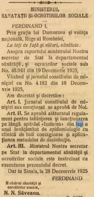 „Art. II. Se aprobă alăturatul regulament pentru înființarea și funcționarea pe lângă spitalul «Izolarea» din Iași a unui învățământ de epidemiologie cu clinică de boli contagioase și aplicațiunea metodelor de dezinfecție.
