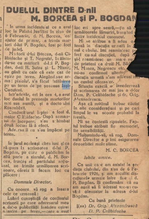 În urma incidentului ce a avut loc la Palatul Justiției în ziua de 6 Februarie, d. M. Borcea, fost ajutor de primar, a trimis martori d-lui P. Bogdan, fost prefect de județ. Martorii d-lui Borcea, d-nii Cilibidache și T. Negruzzi, înâlnindu-se cu martorii d-Li P. Bogdan, d-nii H. Sutzu și L. Missir, au găsit cu cale că este caz de eșire pe teren. Alegându-se arma: pistolul, s’a făcut întâlnirea pe un teren de pe șoseaua Iași-Cucuteni.