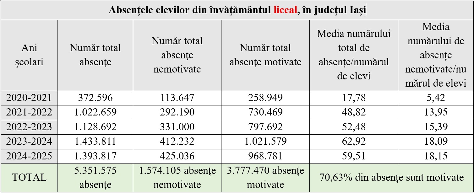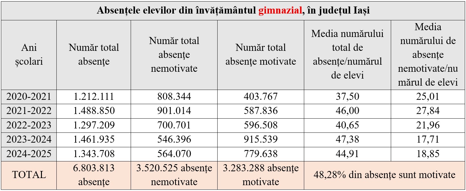 Datele Inspectoratului Școlar Județean (ISJ) Iași pentru intervalul 2020-2025 arată că cei mai absenți elevi din județ sunt cei din învățământul gimnazial și liceal. În total, în județul Iași, peste 17 milioane de absențe au fost înregistrate în ultimii cinci ani, iar 38,73% dintre acestea aparțin elevilor din clasele V-VIII, adică celor din învățământul gimnazial.