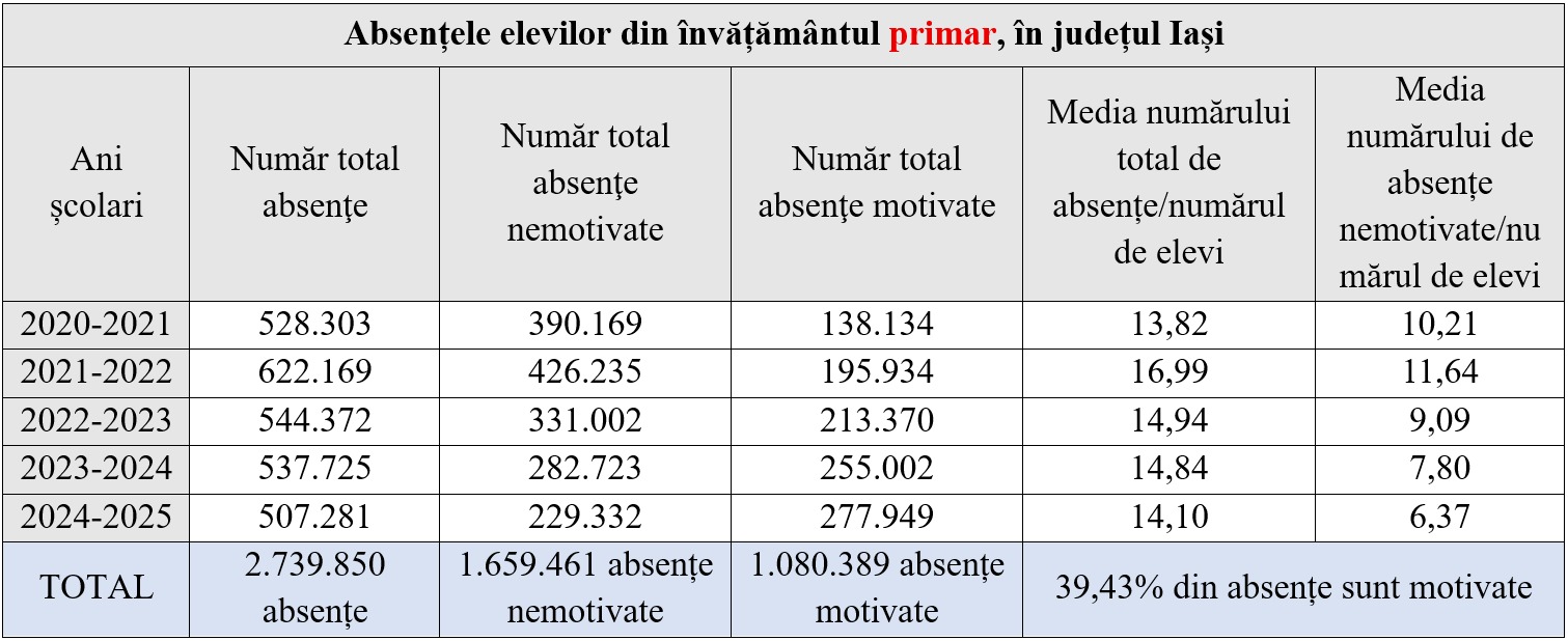 Cele mai puține absențe acumulate în județul Iași, în ultimii cinci ani școlari, au fost înregistrate la învățământul primar. Sunt 2,73 milioane de absențe din 2020 până în 2025, dintre care 1,65 milioane au rămas nemotivate.
