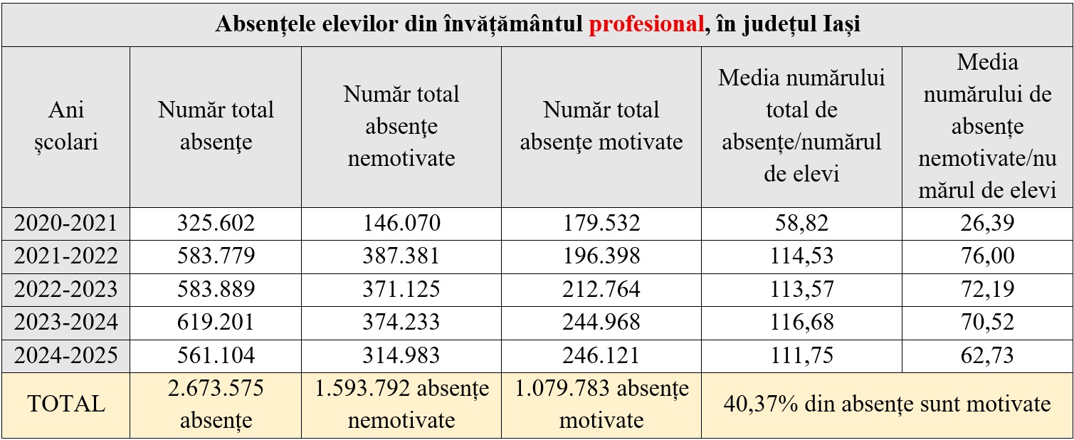 În cazul învățământului profesional, cele 2,67 de absențe înregistrate în ultimii cinci ani școlari ridică semne de întrebare, întrucât numărul elevilor din acest tip de învățământ este mai mic față de cel din celelalte cicluri. Astfel, din 2021 până în 2025, media absențelor per elev nu a fost sub 111 absențe într-un an școlar.