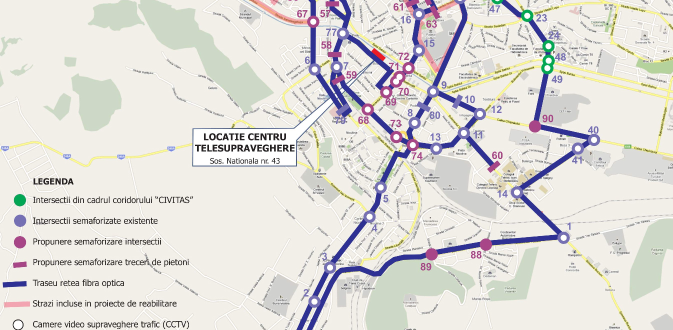 Potrivit proiectului tehnic al sistemului de management al traficului, 18 intersecţii noi sunt propuse pentru semaforizare, la unele dintre acestea fiind deja montate instalaţiile. În total, 90 de intersecţii din oraş sunt prinse în proiect, semafoarele existente fiind înlocuite. Majoritatea dintre acestea vor fi dotate şi cu camere video, în contextul în care 59 de dispozitive vor fi instalate. La finalizarea proiectului, în luna septembrie a acestui an, traficul de pe raza oraşului va fi monitorizat dintr-un centru de supraveghere de pe şoseaua Naţională, iar responsabilii ar urma să fie anunţaţi prin SMS de orice anomalie apărută la un semafor.