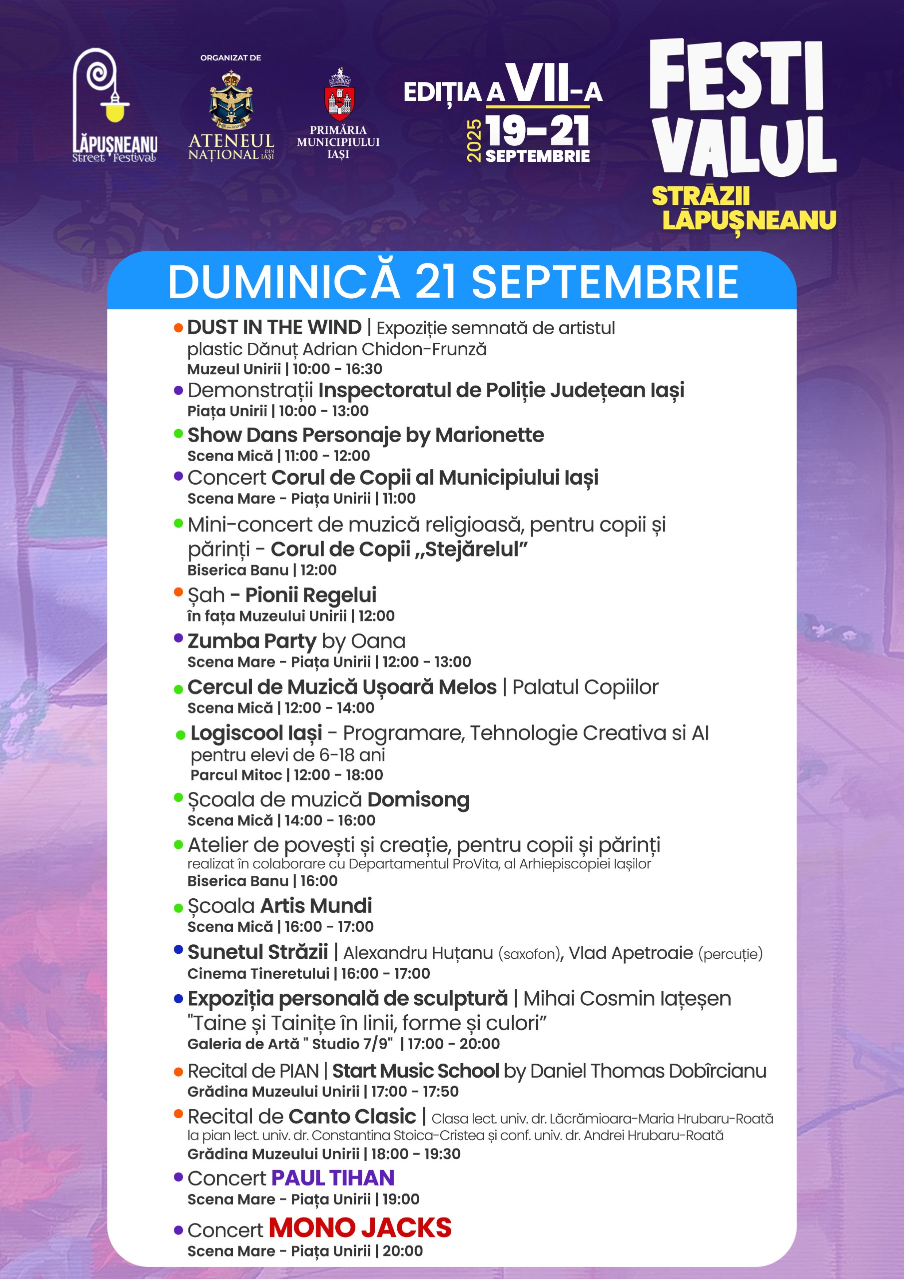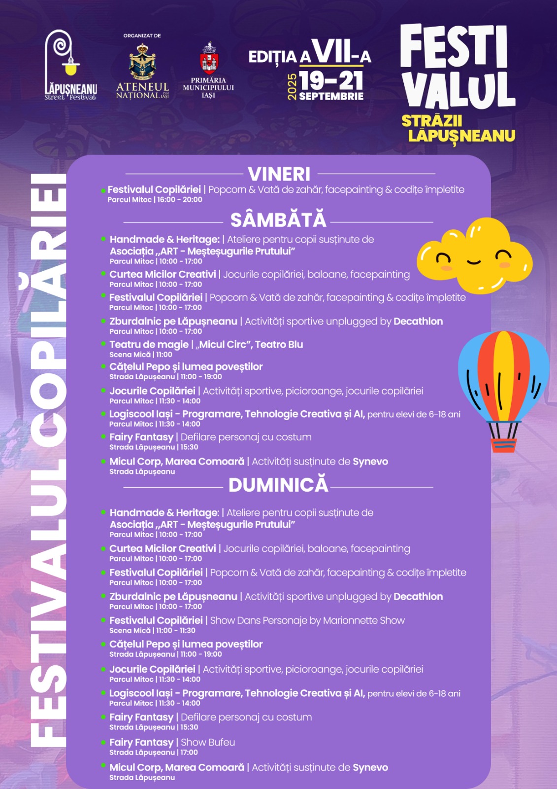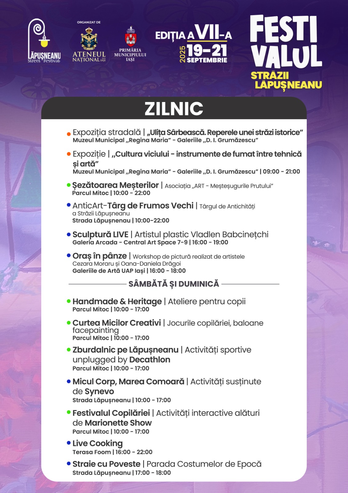 Timp de trei zile, ieșenii sunt invitați să participe la spectacole, concerte, ateliere și activități pentru toate vârstele, desfășurate pe două scene principale – în Piața Unirii și în Parcul Mitoc – dar și în alte spații emblematice din centrul orașului.